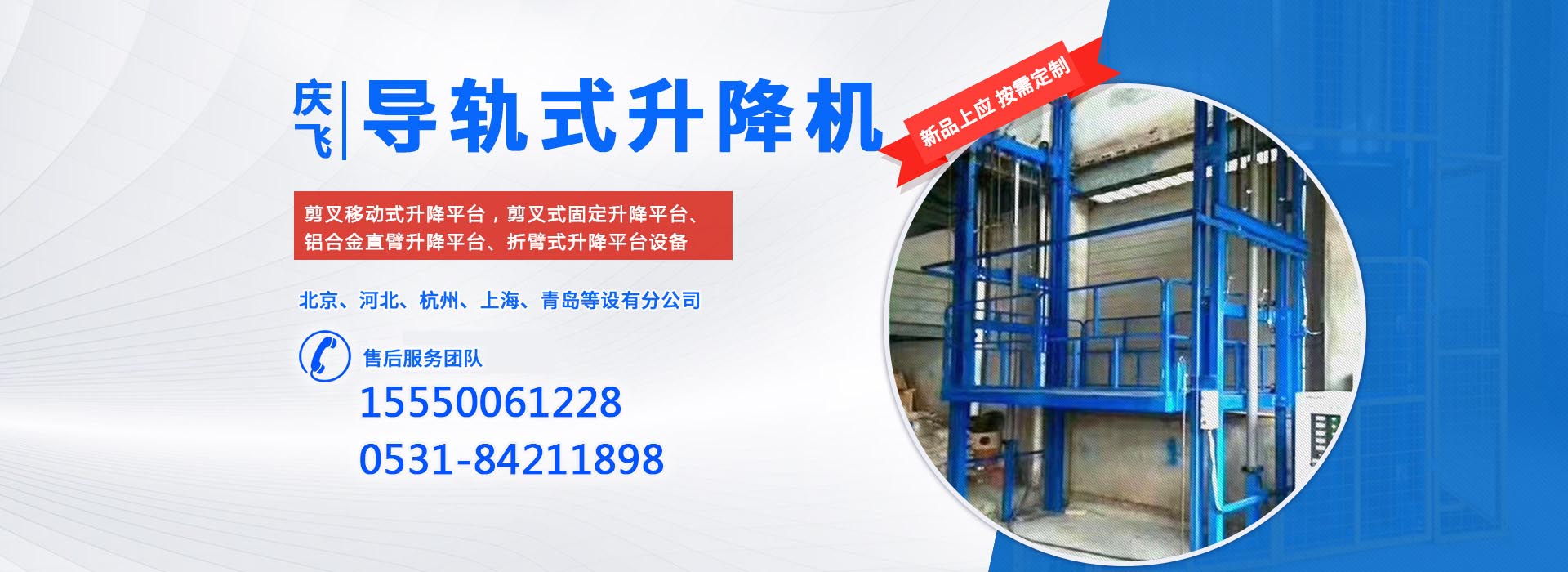 濟南慶飛機械設備有限公司目前專心致力于液壓升降平臺領域。公司主要產品有:剪叉移動式升降平臺,剪叉式固定升降平臺、鋁合金直臂升降平臺、折臂式升降平臺、曲臂式升降平臺、車載式升降平臺、牽引式升降平臺、自動行走式升降平臺、移動式固定式登車橋、桅柱式鋁合金升降平臺、鋁合金升降舞臺、固定軌道臺面旋轉式升降平臺等,產品廣泛適用于電力、通訊、路燈、交通、交警、建筑裝簧、園林、廣告、高速公路、大型廠礦企業等領域,還可根據用戶的需求設計制造包括特殊尺寸、承載能力、防爆電器的液壓升降臺。